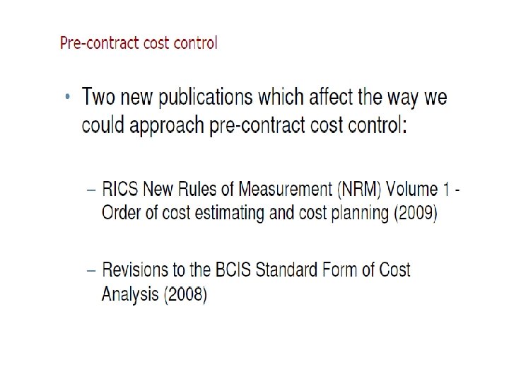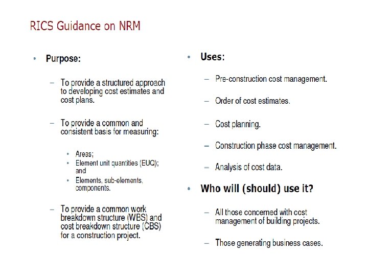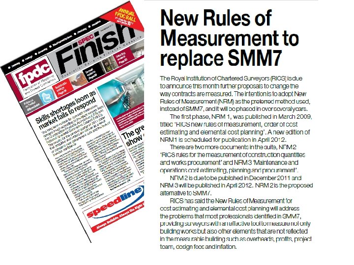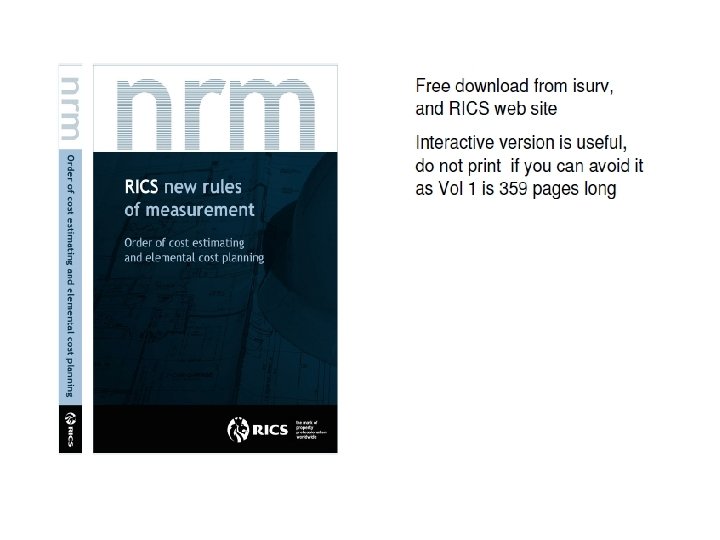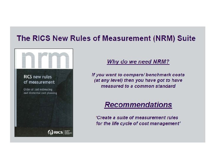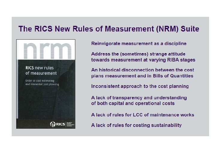 To conclude. . . . New Rules of Measurement The New Rules of Measurement (NRM) are a suite of documents issued by the RICS Quantity Surveying and Construction Professional Group. These have been developed to provide a standard set of measurement rules that are understandable to all those involved in a construction project. The rules aim to take a cradle-to-grave approach to the procurement of construction projects, and include cost estimating, works procurement and post-construction procurement. As well as covering the traditional costs that are reflected in measurable building work, the NRM encompass a range of other issues. These include overheads, profit and inflation, and other costs including consultants’ fees, land costs, and planning obligations. Guidance is also provided on dealing with tax allowances and grants. Part of the rationale for the new rules is to provide central governments, local governments and other public sector bodies with a value-for-money framework. More accurate cost estimation should also give reassurance to banks which are lending for construction projects. RICS supports the need to develop standard methods of measurement and reporting for sustainability across the property, land construction sectors through the use of the NRM. Although the NRM are based on UK practice, the basic principles should be applicable globally.