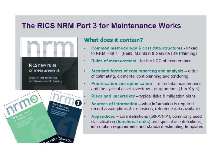 NRM Volume 2 • This volume, RICS new rules of measurement: bill of quantities for works procurement, provides fundamental guidance on the quantification and description of building works for the purpose of preparing bill of quantities and quantified schedules of works; it also provides a sound basis for designing and developing standard or bespoke schedules of rates. Direction on how to deal with items that are unquantifiable is also provided – e. g. preliminaries, overheads and profit, contractor designed works, risk transfer and fluctuations. • The RICS new rules of measurement: bill of quantities for works procurement provides a uniform basis for measuring and describing building works and embodies the essentials of good practice. • This First Edition will become operative on 3 January 2012 and is post dated accordingly.
