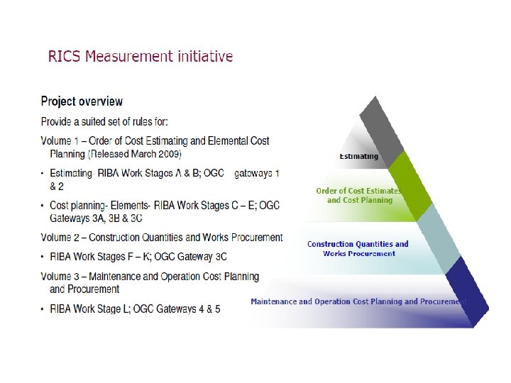 Key issues England • The Office of Government Commerce (OGC) and UK Government departments involved in construction procurement should use NRM as their standard model. • NRM are aligned with both the RIBA Plan of Work and OGC Gateway Process. • The NRM have the potential to reduce overspends that have affected many major construction projects. The role of Chartered Surveyors The QS and Construction Professional Group is the largest member group within RICS. Members have worked on the procurement and cost estimating aspects of construction projects throughout the world including the Beijing Olympics, Crossrail in London and the Burj al Arab hotel in Dubai.