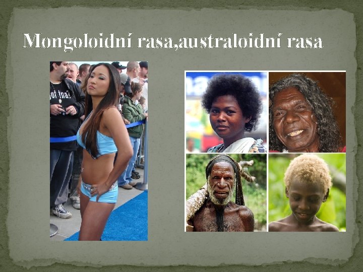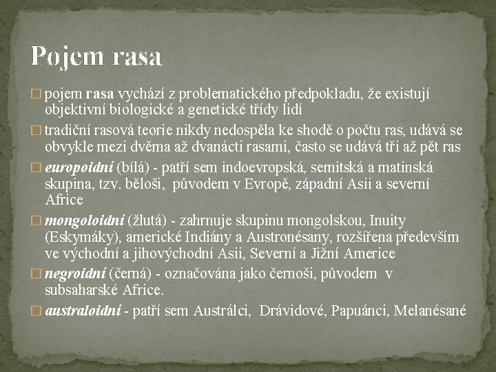 Pojem rasa � pojem rasa vychází z problematického předpokladu, že existují objektivní biologické a genetické třídy lidí � tradiční rasová teorie nikdy nedospěla ke shodě o počtu ras, udává se obvykle mezi dvěma až dvanácti rasami, často se udává tři až pět ras � europoidní (bílá) - patří sem indoevropská, semitská a matinská skupina, tzv. běloši, původem v Evropě, západní Asii a severní Africe � mongoloidní (žlutá) - zahrnuje skupinu mongolskou, Inuity (Eskymáky), americké Indiány a Austronésany, rozšířena především ve východní a jihovýchodní Asii, Severní a Jižní Americe � negroidní (černá) - označována jako černoši, původem v subsaharské Africe. � australoidní - patří sem Austrálci, Drávidové, Papuánci, Melanésané