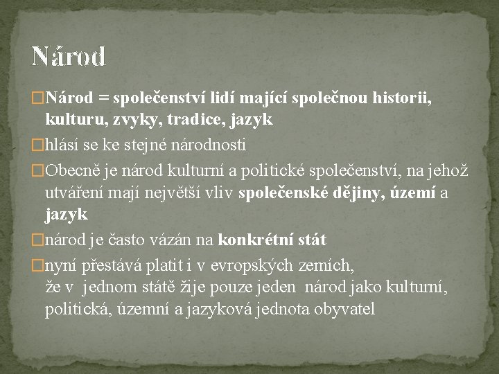 Národ �Národ = společenství lidí mající společnou historii, kulturu, zvyky, tradice, jazyk �hlásí se ke stejné národnosti �Obecně je národ kulturní a politické společenství, na jehož utváření mají největší vliv společenské dějiny, území a jazyk �národ je často vázán na konkrétní stát �nyní přestává platit i v evropských zemích, že v jednom státě žije pouze jeden národ jako kulturní, politická, územní a jazyková jednota obyvatel
