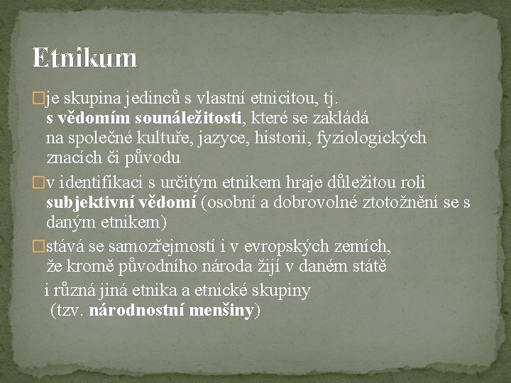 Etnikum �je skupina jedinců s vlastní etnicitou, tj. s vědomím sounáležitosti, které se zakládá na společné kultuře, jazyce, historii, fyziologických znacích či původu �v identifikaci s určitým etnikem hraje důležitou roli subjektivní vědomí (osobní a dobrovolné ztotožnění se s daným etnikem) �stává se samozřejmostí i v evropských zemích, že kromě původního národa žijí v daném státě i různá jiná etnika a etnické skupiny (tzv. národnostní menšiny)