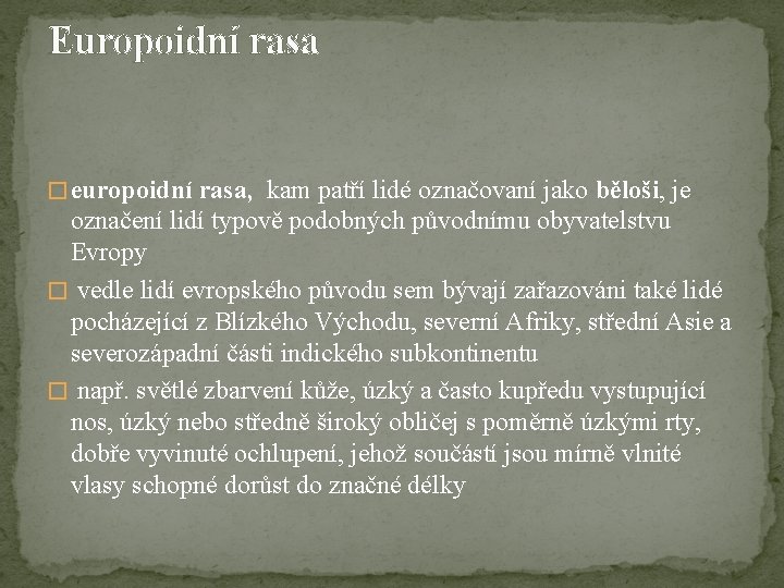Europoidní rasa � europoidní rasa, kam patří lidé označovaní jako běloši, je označení lidí typově podobných původnímu obyvatelstvu Evropy � vedle lidí evropského původu sem bývají zařazováni také lidé pocházející z Blízkého Východu, severní Afriky, střední Asie a severozápadní části indického subkontinentu � např. světlé zbarvení kůže, úzký a často kupředu vystupující nos, úzký nebo středně široký obličej s poměrně úzkými rty, dobře vyvinuté ochlupení, jehož součástí jsou mírně vlnité vlasy schopné dorůst do značné délky
