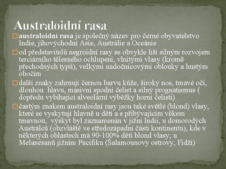Australoidní rasa � australoidní rasa je společný název pro černé obyvatelstvo Indie, jihovýchodní Asie, Austrálie a Oceánie � od představitelů negroidní rasy se obvykle liší silným rozvojem terciárního tělesného ochlupení, vlnitými vlasy (kromě přechodných typů), velkými nadočnicovými oblouky a hustým obočím � další znaky zahrnují černou barvu kůže, široký nos, tmavé oči, dlouhou hlavu, masivní spodní čelist a silný prognatismus ( dopředu vybíhající alveolární výběžky horní čelisti) � častým znakem australoidní rasy jsou také světlé (blond) vlasy, které se vyskytují hlavně u dětí a s přibývajícím věkem tmavnou, výskyt byl zaznamenán v jižní Indii, u domorodých Austrálců (obzvláště ve středozápadní části kontinentu), kde v některých oblastech má 90 -100% dětí blond vlasy; u Melanésanů jižním Pacifiku (Šalamounovy ostrovy, Fidži)