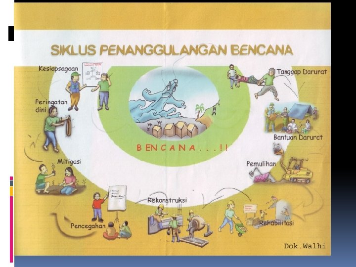 Disaster Management Pre Disaster In Disaster Post Disaster • Mitigasi : Hazard Material, Early Warning, Preparedness • Tanggap darurat • Rehabilitation • Reconstruction