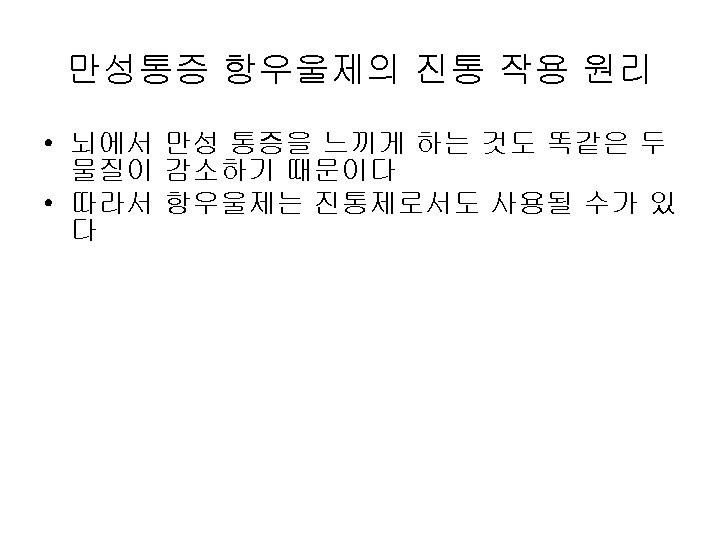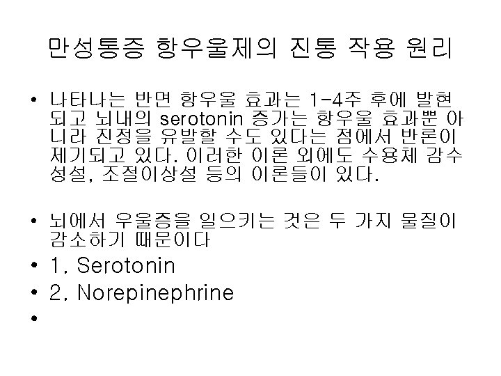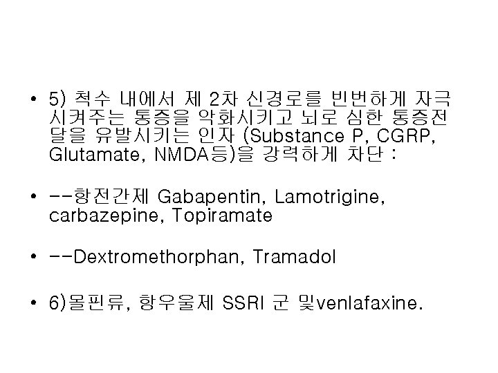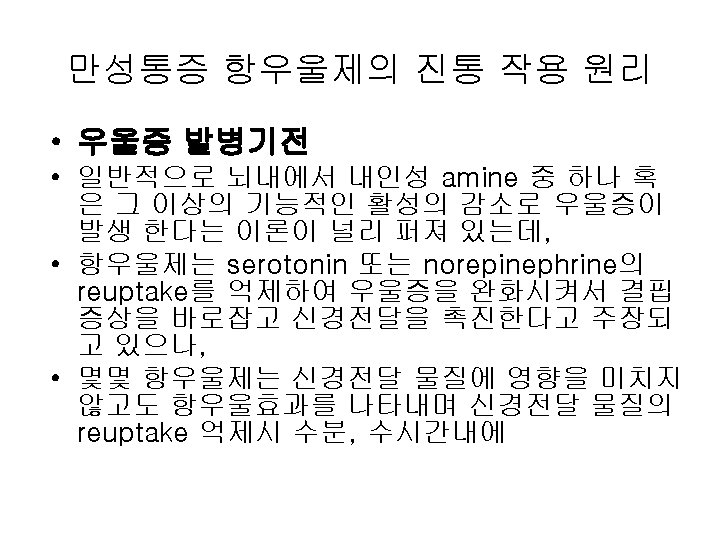NSAIDs NSAIDs Nonsteroidal anti imflamatory drugs CNS Pyrazolones Slides: 21 Download presentation NSAIDs NSAIDs • Non-steroidal anti imflamatory drugs 분류 위장관 소화성궤양 CNS 이명 간염 신장애 골수억제 + + ++ + + +++ + + +++ + + + Pyrazolones Azapropazone Oxyphenbutazone Phenylbutazone ++++ ++++ + + + ++++ Acetis acid Diclofenac Ketoloac Indomethacin Sulindac Tolmetin ++ ++++ + +++ + + +++ ++++ + ++ + + + + + ++ + + + + + + Propionic acid Fenoprofen Flubiprofen Ibuprofen Ketoprophen Naproxen ++ ++++ + +++ ++ + + + + + + Oxicam Piroxicam Tenoxicam ++++ ++ + + + + + ++ + Acetaminophen Salicylates Aspirin Choline magnesium salicylate Diflunisal Salsalate Sodium salicylate Fenamics Mefenamic acid Medofenamate Nabumetone Anaphylaxis 항우울제 약리작용 부작용 NE 5 HT DA 항콜린작용 경련성발작 진정작용 기립성 저혈압 부정맥 2+ 1+ 3+ 4+ 2+ 4+ 5+ 2+ 4+ 1+ 2+ 3+ 2+ - - - 4+ * 3+ 4+ 3+ 2+ 3+ 3+ * 3+ 3+ 3+ 2+ 2+ 4+ * 4+ 3+ 4+ 2+ 3+ 1+ 3+ * 2+ 4+ 3+ 1+ 3+ 1+ 2+ 4+ * 2+ 4+ 2+ 3+ 4+ 3+ 0/1+ - 3+ 4+ 3+ 2+ 3+ 0 3+ - - 2+ 3+ 3+ 1+ 0/1+ 2+ - 4+ - - 1+ - * * 1+ * * 삼환계 3급 amine 류 Amitriptyline Clomipramine Doxepine Imipramine Trimipramine 2급 amine 류 Amoxapine Desipramine Nortriptyline Protriptyline 사환계 Maprotiline Triazolopyridine계 Trazodone Aminoketone계 Bupropion 선택적 serotonin reuptake 억제제 (SSRI) Fluoxetine Paroxetine Sertraline 0/1+ 5+ 5+ 5+ • • 3) 말초 신경의 Calcium Channel 차단: • --항전간제: Gabapentin. Lamotrigine. • 4) 통증을 악화시키는 교감신경부위 • (Sprouting Sympathetic Axons)를 차단: • --3급 아민 항우울제: Bupropion, Venlafaxine. • •