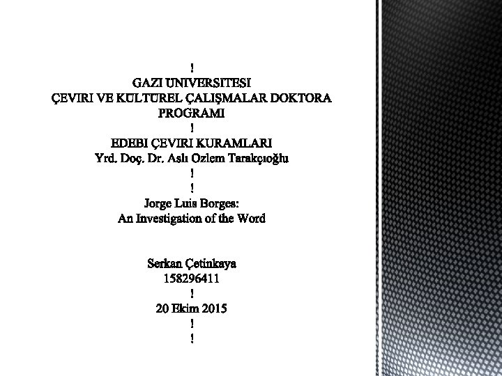 § Borges’in yazınsal eserlerinin yanı sıra çok geniş alanı kapsayan konularda yüzlerce denemesinin olduğunu kaynak eserden öğreniyoruz. Ele aldığımız metin “An Investigation of the word” İspanyolca kaynak metinden Suzan Jill Levin ve Eliot Weinberger tarafından çevrilmiştir.