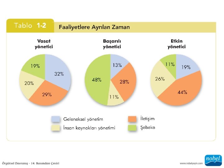 Etkin Yönetim Faaliyetleri mi, Başarılı Yönetim Faaliyetleri mi? • Yöneticilik Faaliyetleri: 1. Geleneksel yönetim: Karar alma, planlama ve denetleme 2. İletişim: Rutin bilgi alışverişi ve masabaşı işlerinin yürütülmesi 3. İnsan kaynakları yönetimi: Çalışanların motive ve disipline edilmesi, personel alımı, eğitimi ve çatışmaları çözümü 4. Sosyal ağ oluşturma: Örgüt dışından bireylerle sosyalleşme, politik ilişkiler geliştirme ve etkileşimde bulunma Tablo 1 -2