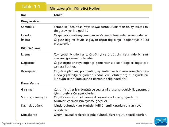 Yönetimin Rolleri • Bireyler Arası Roller • Bilgi Sağlama Rolleri • Karar Verme Rolleri Tablo 1 -1