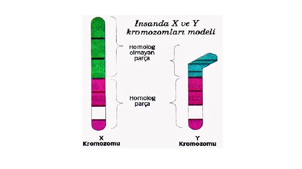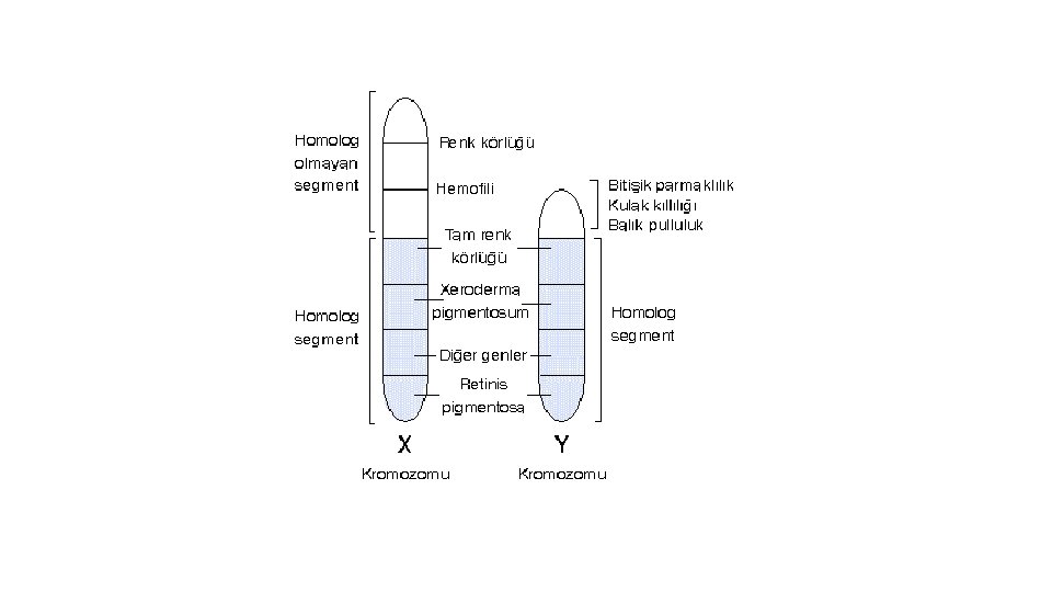 Hem X Hem Y ile Aktarılanlar • X ve Y kromozomunun homolog bölgesindeki genlerle aktarılırlar. Otozomlardaki normal karakterler gibi kalıtılırlar. Yani hem erkek hem dişilerde aynı oranlarda görülebilirler. İnsandaki tam renk körlüğü ve diğer bazı göz rahatsızlıkları böyle aktarılır.