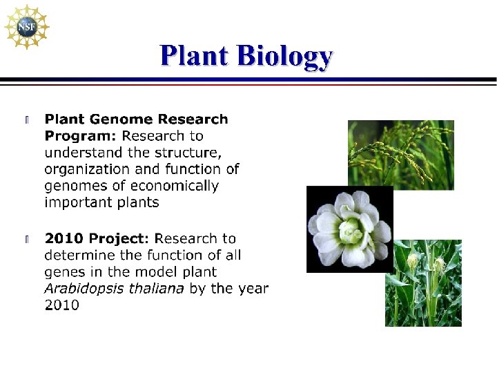 Plant Genome Research Program Three kinds of activities will be supported in FY 2006: n n n Research to tackle unanswered questions in plant biology on a genome-wide scale Translational research to move findings from model systems into plants of economic importance Tools and resource building