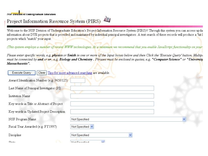 Sources of Information on NSF Funding Opportunities § Web: www. nsf. gov § Grant Proposal Guide: http: //www. nsf. gov/pubs/gpg/nsf 04_23/ § NSF – Awards: http: //www. nsf. gov/awardsearch/ § Program Officer § Colleagues