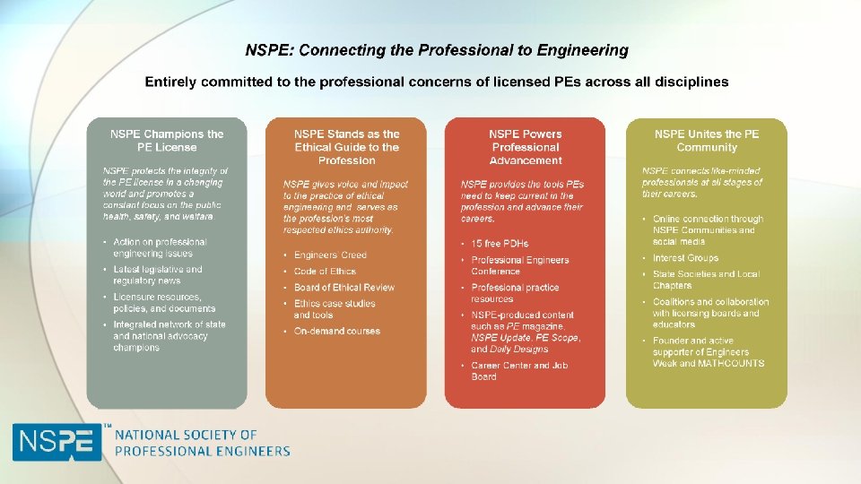 • NSPE Champions the PE License • NSPE Stands as the Ethical Guide to the Profession • NSPE Powers Professional Advancement • NSPE Unites the PE Community
