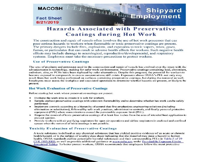 LAB REPORT � HOW DOES THE DATA IN A LAB REPORT HELP WITH MITIGATING HEALTH AND SAFETY RISKS? � WHAT DOES THE LAB REPORT ACTUALLY TELL YOU? � WHAT CAN MACOSH DO TO AID SMALLER SHIPYARDS WITH UNDERSTANDING THE PROCESS TO PROTECT WORKERS? � WHERE DO YOU START?