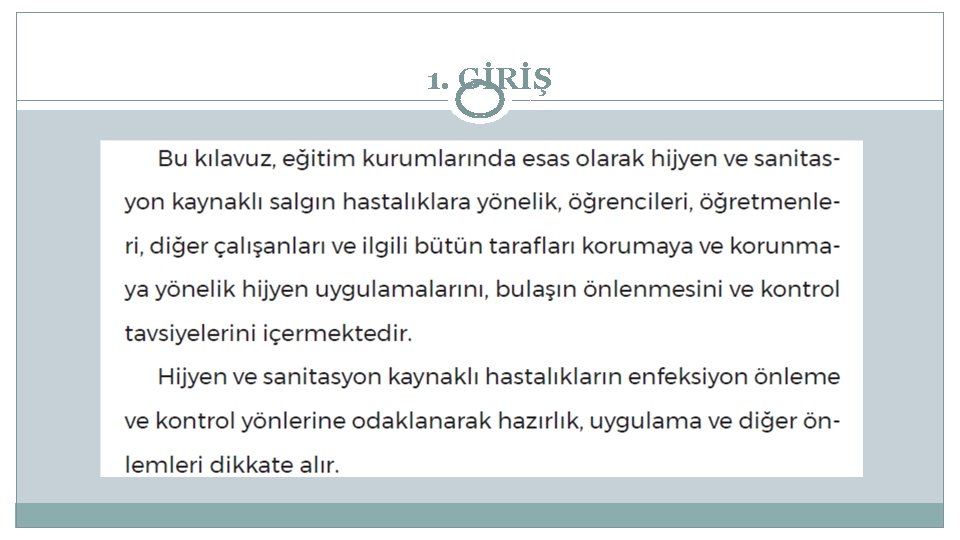 1. GİRİŞ Bu klavuzdaki enfeksiyon önleme ve kontrol önerilerinin, hijyen ve sanitasyon kaynaklı salgın hastalıklara yanıt olarak iyi bir uygulama olduğu kabul edilir.