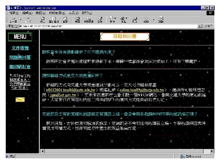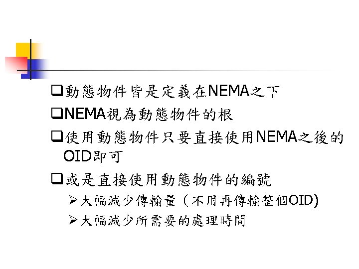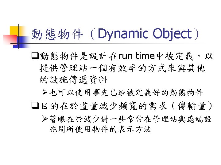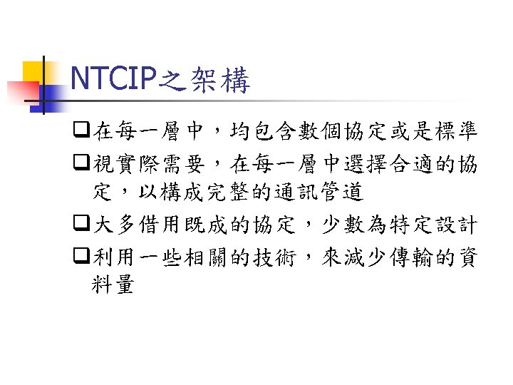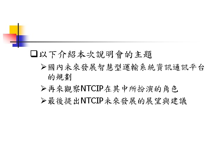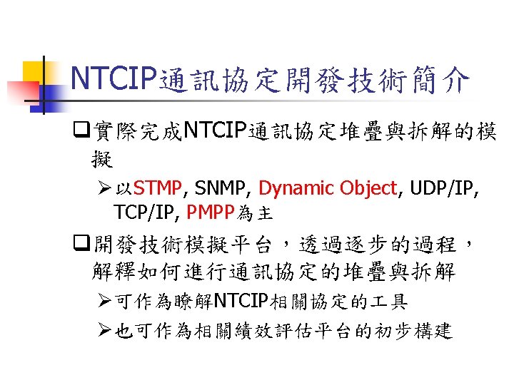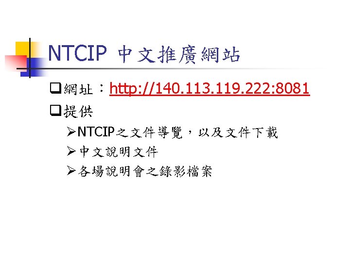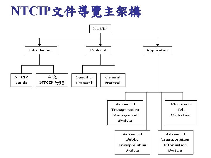 NTCIP 03 573 1737 03 572 5804FAX Jinyuancc Slides: 29 Download presentation NTCIP簡介與文件導覽 交通大學 運輸研究中心 王晉元 03 -573 -1737, 03 -572 -5804(FAX) Jinyuan@cc. nctu. edu. tw NTCIP的通訊模組及層級 Information Application Transport Subnetwork Plant PMPP 的資料框架(Data Frame) Simple Transportation Management Framework(STMF) ASN. 1程式語言 MIB 利用BER或OER編碼方式將 ASN. 1訊息重新編碼 SNMP STMP 管理中心 SNMP(Simple Network Management Protocol) PDU Header Application Version Community Header PDU本體 PDU PDU TYPE Request ID Error Status Error Index Variable Bindings SEQUENCE Identity Value Variable Bindings STMP(Simple Transportation Management Protocol) q是以SNMP為基礎所開發出之通訊協定 q支援NTCIP中之動態物件 q支援NTCIP在Subnetwork層中定義之 PMPP STMP的資料框架 (Data Frame) PDU本體 PDU Header Application Header Version PDU Header Community Value (Variable Binding) PDU Specific Protocol General Protocol Specific Protocol文件列表 Specific Protocol NTCIP技術文件 文件狀況 中文介紹 RFC文件 PMPP 2101 NTCIPSP-PMPP/RS 232 2102 NTCIP SP-PMPP/FSK 已有可下載文件 中文介紹 已有可下載文件 RFC文件 STMF 2301 NTCIP AP-STMF 已有可下載文件 中文介紹 RFC文件 DATEXASN 2304 NTCIPAP-DATEX-ASN 2501 NTCIP In. P-DATEX 已有可下載文件 中文介紹 尚無可下載文件 RFC文件 Dynamic Objects 中文介紹 RFC文件 APTS