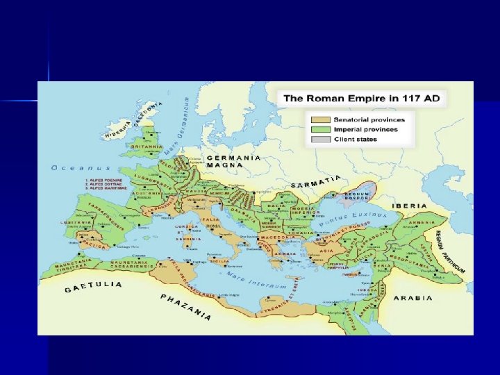 Genişleme Döneminde Roma Ekonomisi Nüfus n n İmparatorluğun nüfusu 2. yüzyılda en yüksek düzeyine ulaşmıştı. Bu tarihten itibaren Batı Roma’nın yıkılışına kadar nüfus düştü. İmparatorluğun son döneminde kronik bir nüfus yetersizliği olduğuyla ilgili kanıtlar çok fazladır. İmparatorluğun nüfusu 2. yüzyılın ortasında 60 milyon civarındaydı. Ortalama nüfus yoğunluğu 16 kişi idi. İtalya, imparatorluğun en yoğun nüfuslu bölgesi olmakla birlikte nüfusu 6 ya da 8 milyonu aşmıyordu.