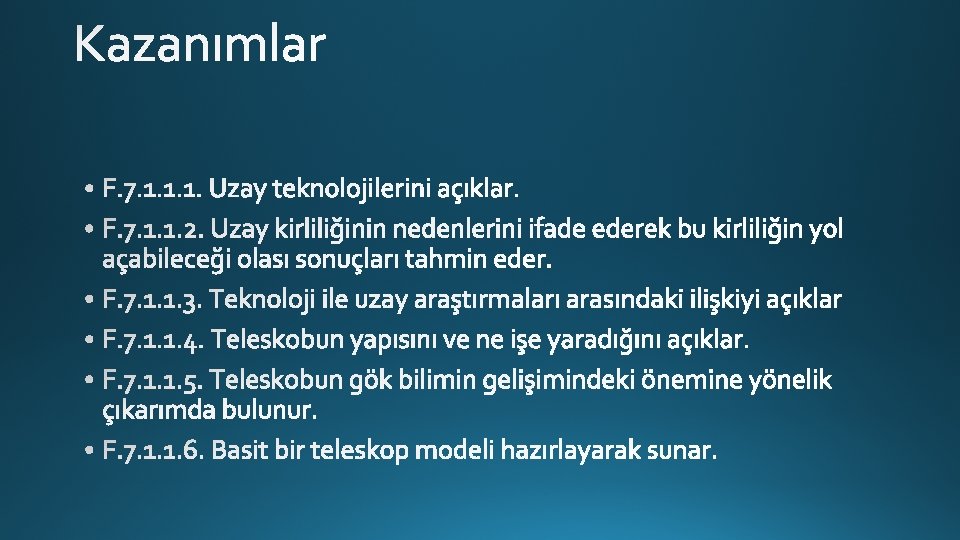 F. 7. 1. 2. 1. Yıldız oluşum sürecinin farkına varır. F. 7. 1. 2. 2. Yıldız kavramını açıklar. F. 7. 1. 2. 3. Galaksilerin yapısını açıklar. F. 7. 1. 2. 4. Evren kavramını açıklar.