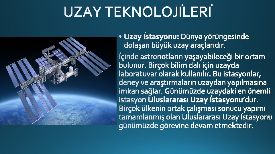Uzay Teleskobu: Yeryüzündeki teleskoplardan daha uzak mesafeleri gösterebilen, uzayda belli bir yörüngede dolaşan güçlü gözlem araçlarıdır. Uzay teleskopları, uzay mekiği ya da uzay roketi yardımıyla yörüngeye yerleştirilir. Dünyadaki olumsuz hava şartlarından ve şehirlerdeki ışık kirliliğinden etkilenmeden doğrudan uzayı gözlemlemeyi sağlayan teleskoplardır. Hubble (Habıl) uzay teleskobu; uzayı, yıldızları, galaksileri keşfetmek için yörüngeye yerleştirilmiştir. Hubble, uzay teleskoplarının en büyüğüdür. Uzayda çok sayıda keşfe imza atan Hubble teleskobu, çektiği uzay fotoğraflarıyla adını dünyaya duyurmuştur.