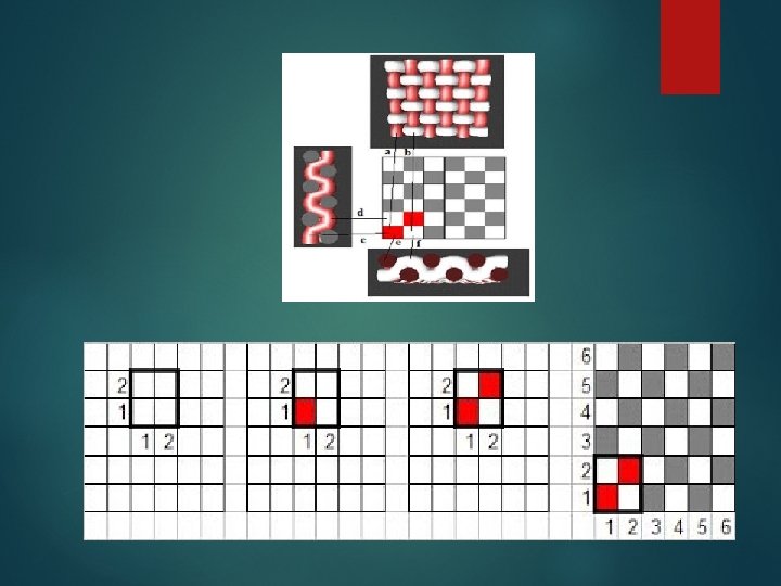 2. 1. 2 ÇÖZGÜ RİPSİ Bezayağı örgüsünün bağlantı noktasının, çözgü ipliği istikametinde 2 veya daha fazla atkı ipliği kadar uzatılmasıyla elde edilen örgülerdir. Bu durum aynı ağızlık içine birden fazla atkı ipliği atılması anlamına gelmektedir. Bu sebeple kumaşta enine yollar oluşturan bir yapısı vardır. Elde edilen bu yapı nedeniyle çözgü rips örgüleri enine rips örgüleri olarak da adlandırılır. Rapor alanı belirlenmesinde çözgü ipliği daima iki olarak kabul edilirken atkı ipliği verilen rapor büyüklüğüne bağlıdır. 2 En küçük düzenli rips örgü raporu ise Rç --------- şeklinde gösterilir. 2