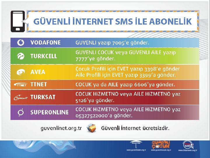 BİLİNÇLİ BİR EBEVEYNİN DİKKATİNE ! TEMEL NOKTALAR Bilgisayarınızı Yaşam Alanınıza Taşıyınız Süre Sınırlaması Yapınız İnternet Arkadaşlarını İyi Tanıyınız Kişisel Bilgilerini Paylaşmamasına Dikkat Ediniz GÜVENLİ İNTERNET HİZMETİ