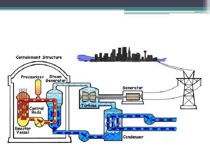 Description of a nuclear power plant • Nuclear fuel, such as uranium-235, goes through fission to produce a lot of heat and energy. • This energy heats up the coolant (water), causing the water to boil. • The boiling water goes through the turbine causing it to rotate which generates electricity.