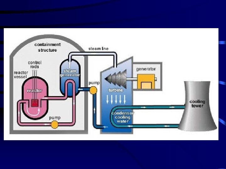 2. Nuclear Power Plants use heat from nuclear reactors to produce electrical energy. They have 5 main components: page 718 a. shielding – radiation absorbing material that is used to decrease exposure to radiation. b. fuel – uranium is most often used c. control rods – neutron absorbing rods that help control the reaction by limiting the number of free neutrons d. moderator – water (sometimes carbon) is used to slow down the fast neutrons produced by fission e. coolant – water acts as a coolant and transports heat between the reaction and the steam turbines to produce electric current Nuclear Power Plants produce a great deal of energy, the current problems with nuclear power plants include environmental requirements, safety of operation, plant construction costs, and storage and disposal of spent fuel and radioactive waste.