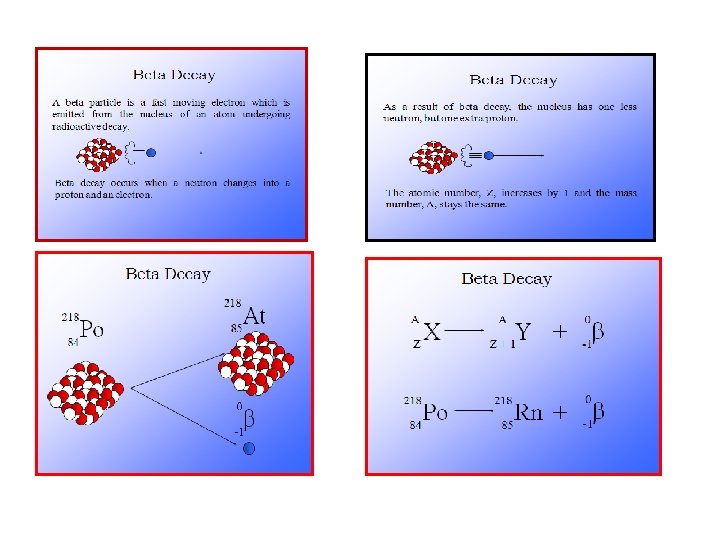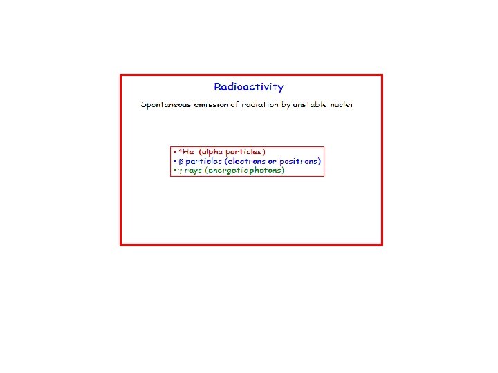 Chemical vs. Nuclear Reactions Chemical Reactions Nuclear Reactions Occur when bonds are broken Occur when nuclei emit particles and/or rays Atoms remain unchanged, although they may be rearranged Atoms often converted into atoms of another element Involve only valence electrons May involve protons, neutrons, and electrons Associated with small energy changes Associated with large energy changes Reaction rate influenced by temperature, particle size, concentration, etc. Reaction rate is not influenced by temperature, particle size, concentration, etc.