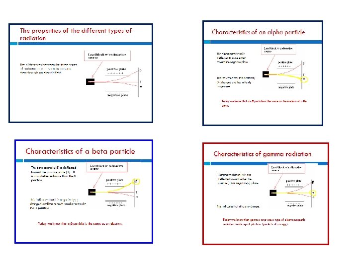 Penetrating power of radiation The ability of radioactive particles to pass through air and other materials is inversely related to their mass. Alpha particles – the least penetrating, they travel only a few centimeters through air. They can be stopped by a single sheet of paper. Beta particles – more penetrating, they travel several meters through air. They can be stopped by a sheet of Al or plastic. Gamma Rays – most penetrating, thick sheets of lead or concrete are required to stop gamma rays.