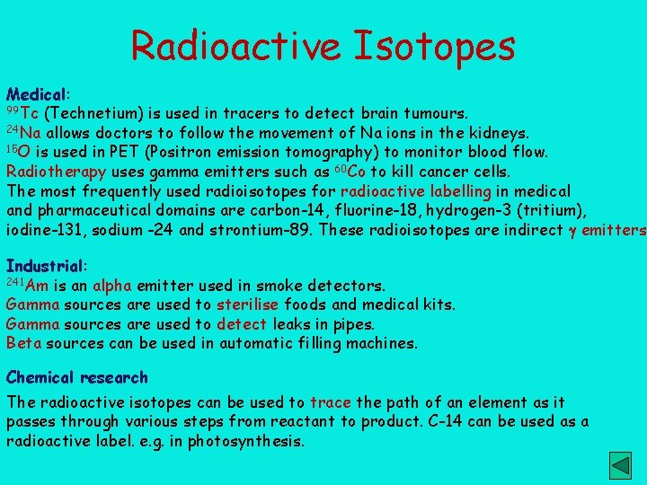 Radioactive Isotopes Medical: 99 Tc (Technetium) is used in tracers to detect brain tumours. 24 Na allows doctors to follow the movement of Na ions in the kidneys. 15 O is used in PET (Positron emission tomography) to monitor blood flow. Radiotherapy uses gamma emitters such as 60 Co to kill cancer cells. The most frequently used radioisotopes for radioactive labelling in medical and pharmaceutical domains are carbon-14, fluorine-18, hydrogen-3 (tritium), iodine-131, sodium -24 and strontium-89. These radioisotopes are indirect emitters, Industrial: 241 Am is an alpha emitter used in smoke detectors. Gamma sources are used to sterilise foods and medical kits. Gamma sources are used to detect leaks in pipes. Beta sources can be used in automatic filling machines. Chemical research The radioactive isotopes can be used to trace the path of an element as it passes through various steps from reactant to product. C-14 can be used as a radioactive label. e. g. in photosynthesis.
