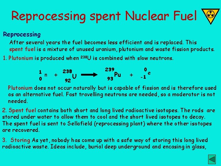 Reprocessing spent Nuclear Fuel Reprocessing After several years the fuel becomes less efficient and is replaced. This spent fuel is a mixture of unused uranium, plutonium and waste fission products. 1. Plutonium is produced when 1 n 0 + 238 92 U 238 U is combined with slow neutrons. 239 93 Pu + 0 e -1 Plutonium does not occur naturally but is capable of fission and is therefore used as an alternative fuel. Fast travelling neutrons are needed, so a moderator is not needed. 2. Spent fuel contains both short and long lived radioactive isotopes. The rods are stored under water to allow them to cool and the short lived isotopes to decay. The spent fuel is sent to Sellafield (reprocessing plant) where the other isotopes are recovered. 3. Storing As yet, nobody has come up with a safe way of storing this long lived radioactive waste. Ideas include, burial deep underground and encasing in glass,