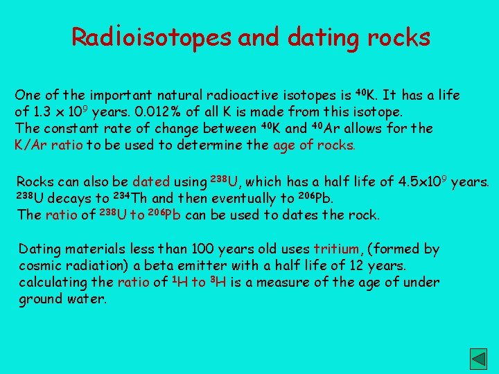 Radioisotopes and dating rocks One of the important natural radioactive isotopes is 40 K. It has a life of 1. 3 x 109 years. 0. 012% of all K is made from this isotope. The constant rate of change between 40 K and 40 Ar allows for the K/Ar ratio to be used to determine the age of rocks. Rocks can also be dated using 238 U, which has a half life of 4. 5 x 109 years. 238 U decays to 234 Th and then eventually to 206 Pb. The ratio of 238 U to 206 Pb can be used to dates the rock. Dating materials less than 100 years old uses tritium, (formed by cosmic radiation) a beta emitter with a half life of 12 years. calculating the ratio of 1 H to 3 H is a measure of the age of under ground water.