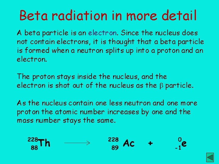 Beta radiation in more detail A beta particle is an electron. Since the nucleus does not contain electrons, it is thought that a beta particle is formed when a neutron splits up into a proton and an electron. The proton stays inside the nucleus, and the electron is shot out of the nucleus as the b particle. As the nucleus contain one less neutron and one more proton the atomic number increases by one and the mass number stays the same.