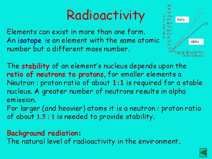 Radioactivity beta Elements can exist in more than one form. An isotope is an element with the same atomic number but a different mass number. 1: 1 alpha The stability of an element’s nucleus depends upon the ratio of neutrons to protons, for smaller elements a Neutron : proton ratio of about 1: 1 is required for a stable nucleus. A greater number of neutrons results in alpha emission. For larger (and heavier) atoms it is a neutron : proton ratio of about 1. 5 : 1 is needed to provide stability. Background radiation: The natural level of radioactivity in the environment.