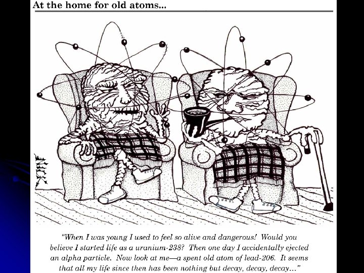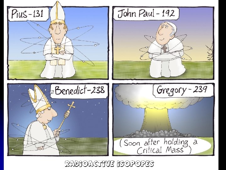 Half Life l Half life – the amount of time it takes for ½ of a radioactive isotope to decay into something else. l Notice the atoms don’t disappear, they just change their identity.
