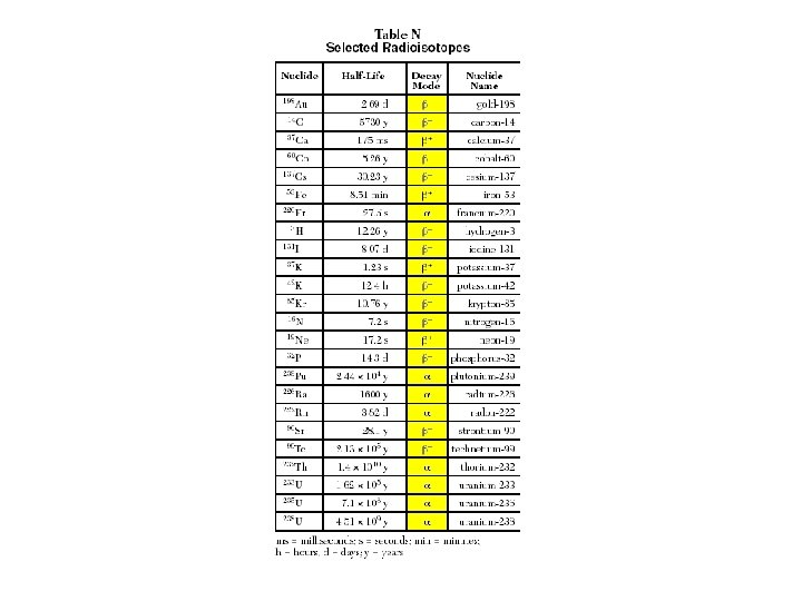 Equations to learn for calculations based on half-life (AP) • Radioactive decay is a first order process; • ln (Nt/No) = -kt • Nt = No e-kt • k = 0. 693/t 1/2 • or t 1/2 = 0. 693/k • (kinetics topic) • k = ? (rate constant or decay constant) • N=? For time interval t