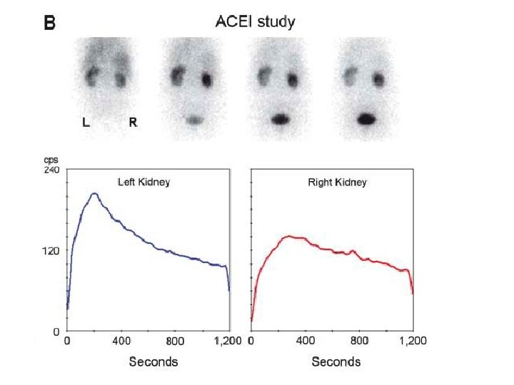 Captopril-enhanced renography • To determine which patients can expect normalization of BP or improvement of BP control after revascularization • ACEi reduce the conversion of angiotensin II - diminishing the vasoconstriction of the postglomerular efferent arteriole and decreasing the GFR, which can be detected by scintigraphy • Both glomerulus-filtered (99 m. Tc-DTPA) and tubulesecreted (99 m. Tc-MAG 3 or 123 I-OIH) - currently used • ACEi – captopril (25 -50 mg) orally 60 min before renography; or iv enalaprilat (40 mg/kg) over 325 min >15 min before renography