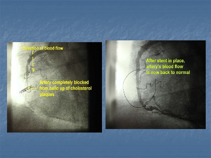 Cardiac Angiography n Coronary angiography is performed to detect obstruction in the coronary arteries of the heart. During the procedure a catheter is inserted into an artery in your groin and then threaded carefully into the heart. The blood vessels of the heart are then studied by injection of contrast media through the catheter. A rapid succession of X-rays is taken to view blood flow.