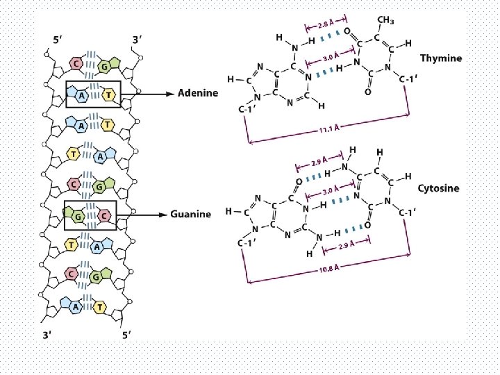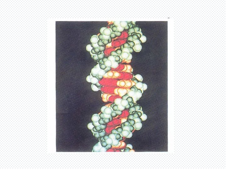 The Double Helix (DNA) Structural model: • Model proposed by Watson & Crick, 1953 • Two sugar-phosphate strands, next to each other, but running in opposite directions. • Specific Hydrogen bonds occur among bases from one chain to the other: A---T , C---G Due to this specificity, a certain base on one strand indicates a certain base in the other. • The 2 strands intertwine, forming a doublehelix that winds around a central axis