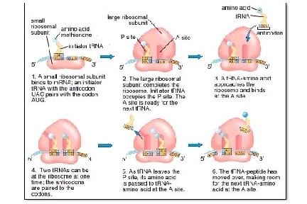 Translation – Step 0 – Preparation • DNA transcribed to m. RNA • m. RNA moves from nucleous to cytoplasm • m. RNA binds to 5+ ribosomes • t. RNA binds to AA (requires an enzyme) AA + t. RNA + ATP → AA-t. RNA + AMP + 2 P i