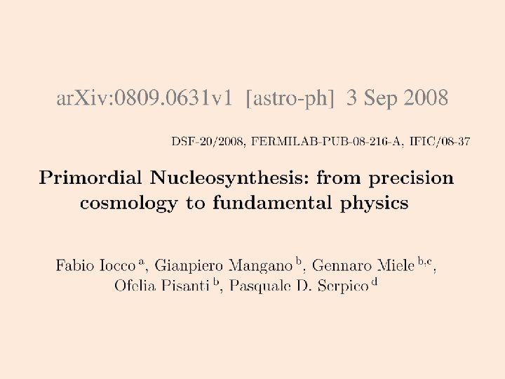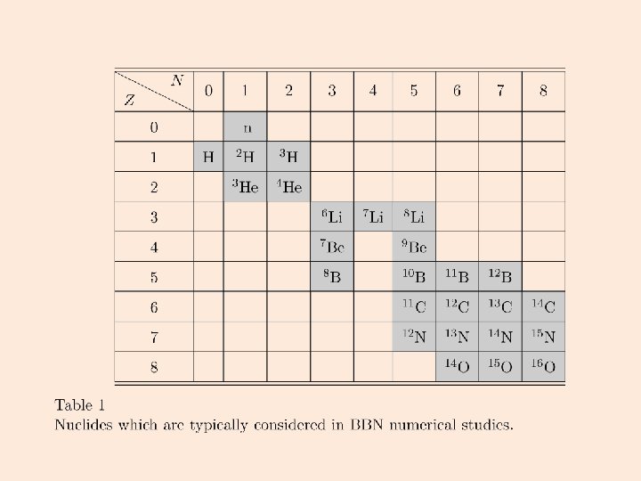 Los datos observacionales son que el 24% de la masa total de bariones en el Universo está en forma de núcleos de Helio. La densidad numérica de núcleos de deuterio y litio es de 10 -5 y 10 -10 veces la del hidrógeno, respectivamente.