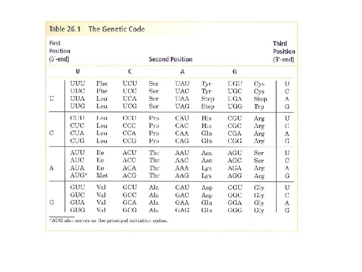 1. The code is degenerate—in other words, often more than one codon calls for the same amino acid to be added to the growing peptide chain. For example there are 6 codons that code for Leu and 6 that code for Arg. Only one codon codes for Met or Trp. 2. The same codon, AUG, is (ALMOST) always used to begin translation of an m. RNA. o AUG that is used to start protein synthesis is called an initiation codon. o AUG calls for the addition of the amino acid methionine both at the start and within the protein.