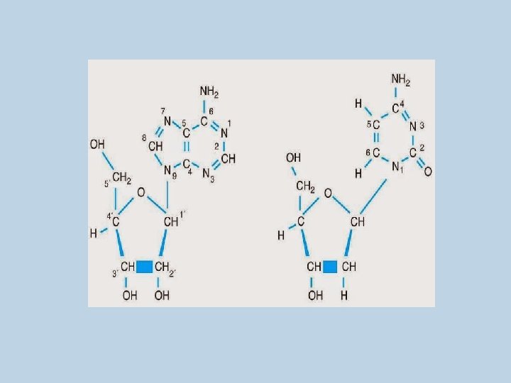 NOMENCLATURA DE NUCLEÓSIDOS • Nucleósido Bases púricas (terminaciòn OSINA) • Desoxinucleósido RIBOSA A • Adenina • Adenosina • Desoxiadenosina • Guanina • Guanosina • Desoxiguanosina • Citosina • Citidina • Desoxicitidina • Uracilo • Uridina • (Desoxiuridina) • Timina • (Timidina) • Desoxitimidina Bases pirimidinicas (terminaciòn IDINA) Cuando contienen el azúcar 2 -desoxiribosa, se nombran agregando el. prefijo desoxi.