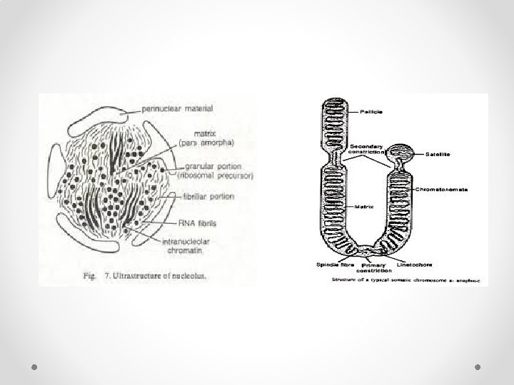 Ultrastructure of Nucleolus § The nucleolus is surrounded by thick covering called perinucleolar chromatin. § The perinucleolar chromatin projects into the nucleolus to form the intranucleolar chromatin. § The peri & intranucleolar chromatin are rich in DNA. § The DNA serves as a template for the synthesis of RNA. § The interior of the nucleolus is filled with a proteinous ground substance called matrix. § The matrix contains a number of fibrils and granules. § The nucleolus is composed of RNA, DNA, proteins and enzymes. § The enzymes are acid phosphatases, nuclease, phosphorylase.