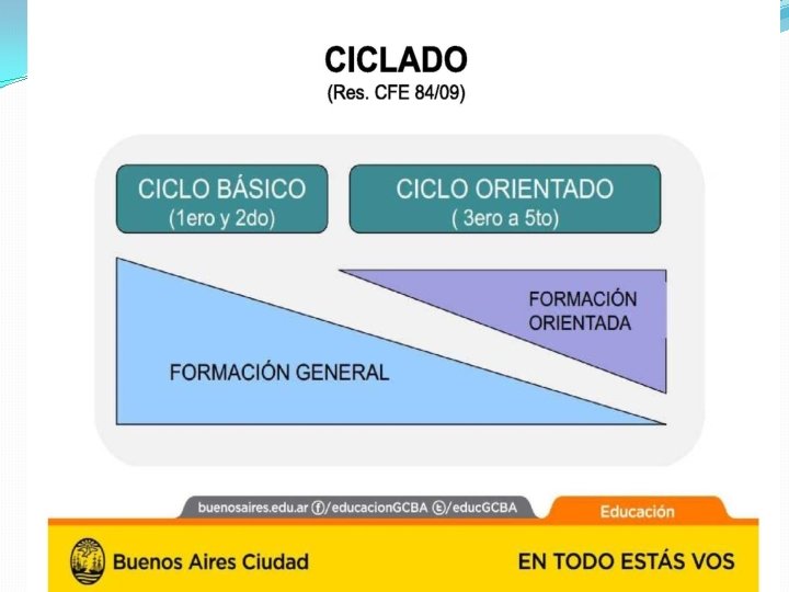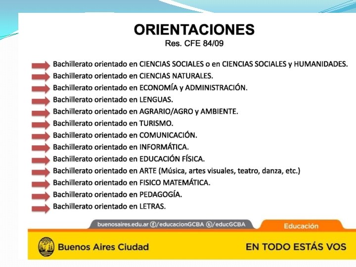 ¿Cuál es la situación a partir de la NES? �Hay un número máximo, una decena de posibles orientaciones �En primer y segundo año, son todas iguales –salvo pequeñas diferencias que cada colegio pueda implementar, por ejemplo, catequesis en un colegio religioso �A partir de tercer año, empiezan a diferenciarse, PERO APENAS EN EL 15% DE LOS CONTENIDOS DEL PLAN DE ESTUDIOS