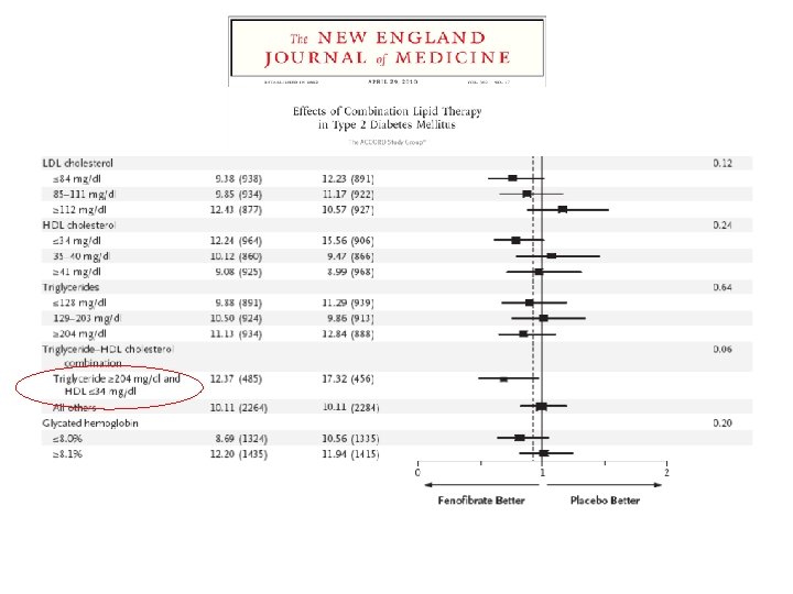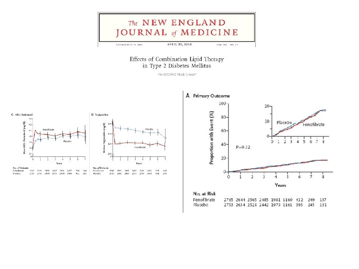 Prevención primaria versus prevención secundaria Riesgo acumulado (%) 10 Eventos coronarios CVD Previo: HR 1, 08 (95% CI 0, 84 -1, 38), p = 0, 55 8 6 Placebo Fenofibrato 4 2 No CVD Previo: HR 0, 75 (95% CI 0, 59 -0, 94), p = 0, 014 0 0 1 2 3 4 5 Tiempo desde aleatorización (años) Nb de riesgo: enfermedad cardiovascular previa (FIELD Study Investigators. Lancet 2005 ; 366 (9500) : 1849 -61) 6