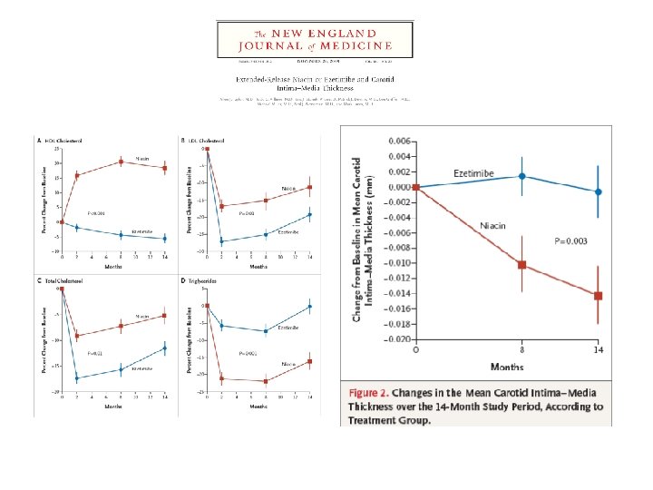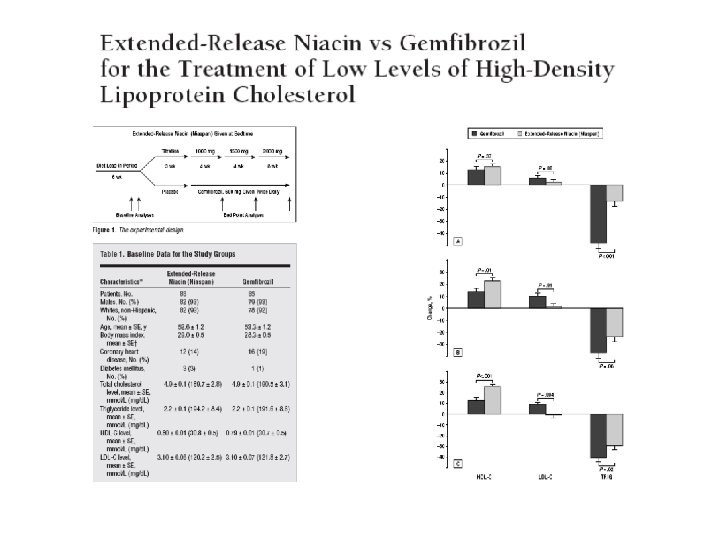 Agente Niacina A favor c-HDL 15%– 35% c-LDL 5%– 25% Triglicéridos 20%– 50% Fibratos c-HDL 10%– 20% c-LDL 5%– 20% Triglicéridos 20%– 50% Estatinas c-HDL 5%– 15% c-LDL 18%– 55% Triglicéridos 7%– 30% En contra Rubefacción Hepatotoxicidad potencial Hiperglucemia Hiperuricemia (gota) Malestar GI superior Dispepsia Cálculos biliares Miopatía Riesgo de miotoxicidad (rabdomiolisis) cuando se combinan con estatinas Miopatía enzimas hepáticas Riesgo de miotoxicidad cuando se combinan con fibratos c-HDL=colesterol de lipoproteínas de alta densidad; c-LDL=colesterol de lipoproteínas de baja densidad Expert Panel on Detection, Evaluation, and Treatment of High Blood Cholesterol in Adults. JAMA. 2001; 285: 2486– 2497. Assmann G y cols. Circulation. 2004; 109(23 suppl 1): III-8–III-14.