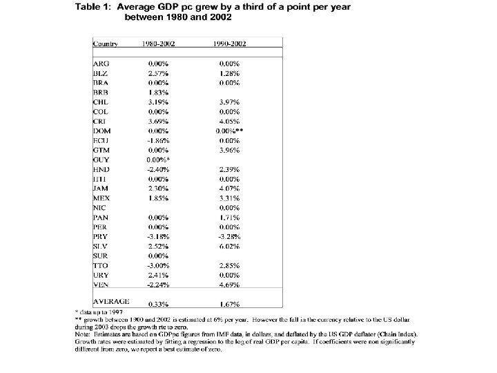 El crecimiento lento se debe a dos factores (1) inestabilidad macro y (2) falta de crecimiento en la productividad Para los Economistas esto se debe a fallas de política económica: Falta de diciplina fiscal Manejo monetario inadecuado Estancamiento en el proceso de reformas de mercado