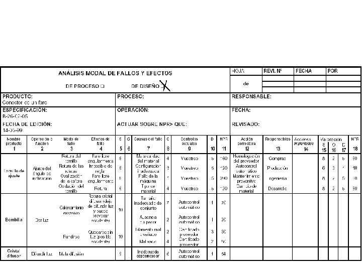 Paso 9. En la columna 9 se anota el tipo de controles existentes, para prevenir la ocurrencia de las causa. En este caso, está previsto un muestreo estadístico para inspeccionar cada uno de los modos de fallo del tornillo de ajuste, y el autocontrol automático y certificados del Proveedor para el resto de modos de fallo de la bombilla y del cristal difusor.