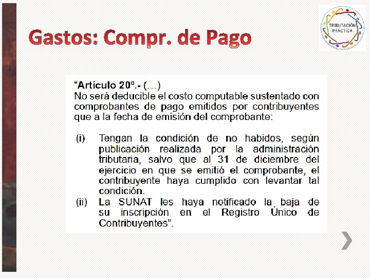 » Art. 20° y 44° de la LIR. » NO se acepta como costo computables o como gasto deducible aquel que se sustente con un C/Pago emitido por un sujeto que, ala fecha de emisión, la SUNAT le haya notificado su baja de oficio en el RUC. ¡RECORDAR! Obligación de verificar que el sujeto emisor esté habilitado.
